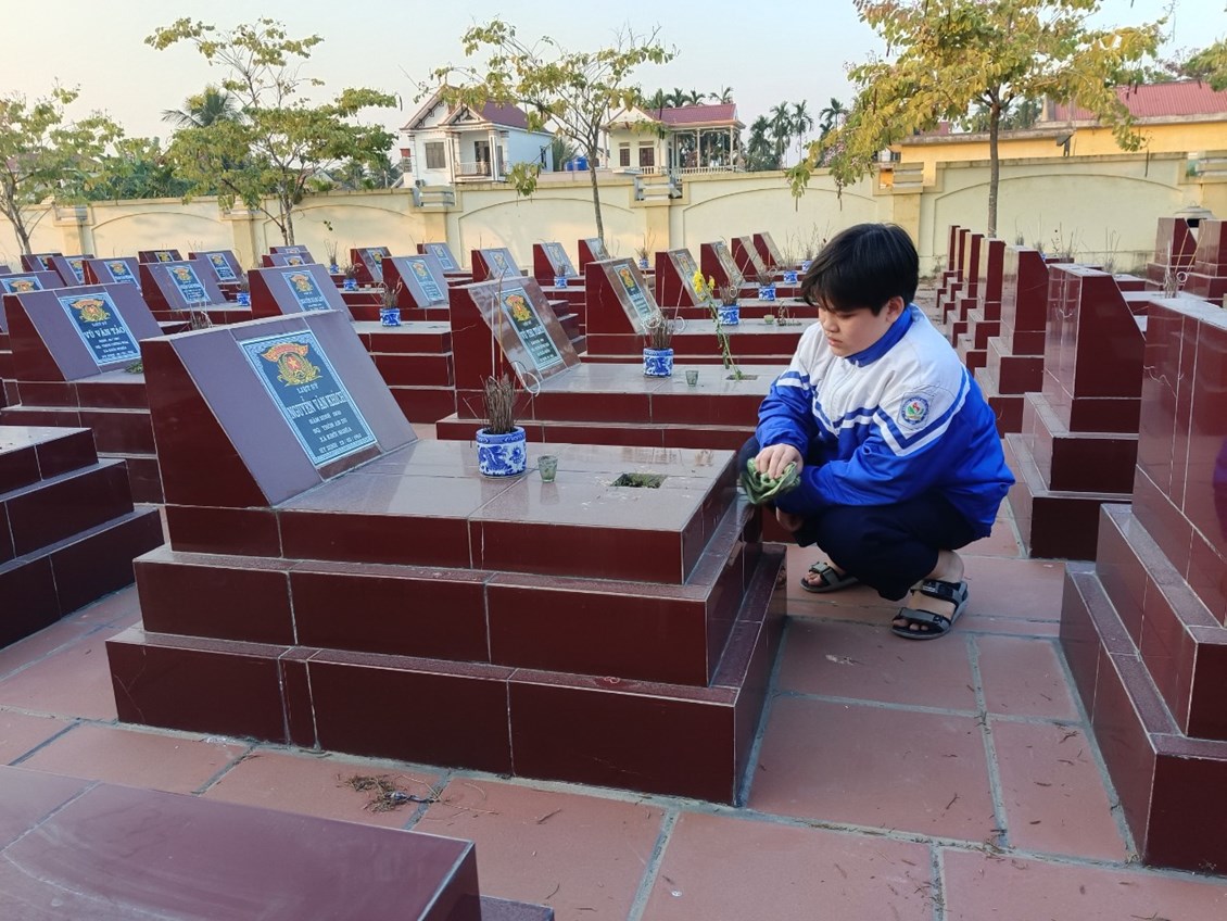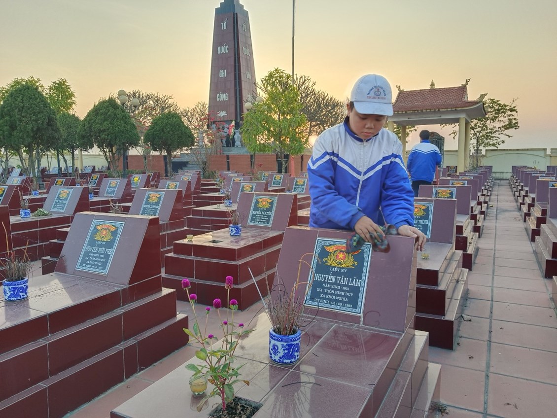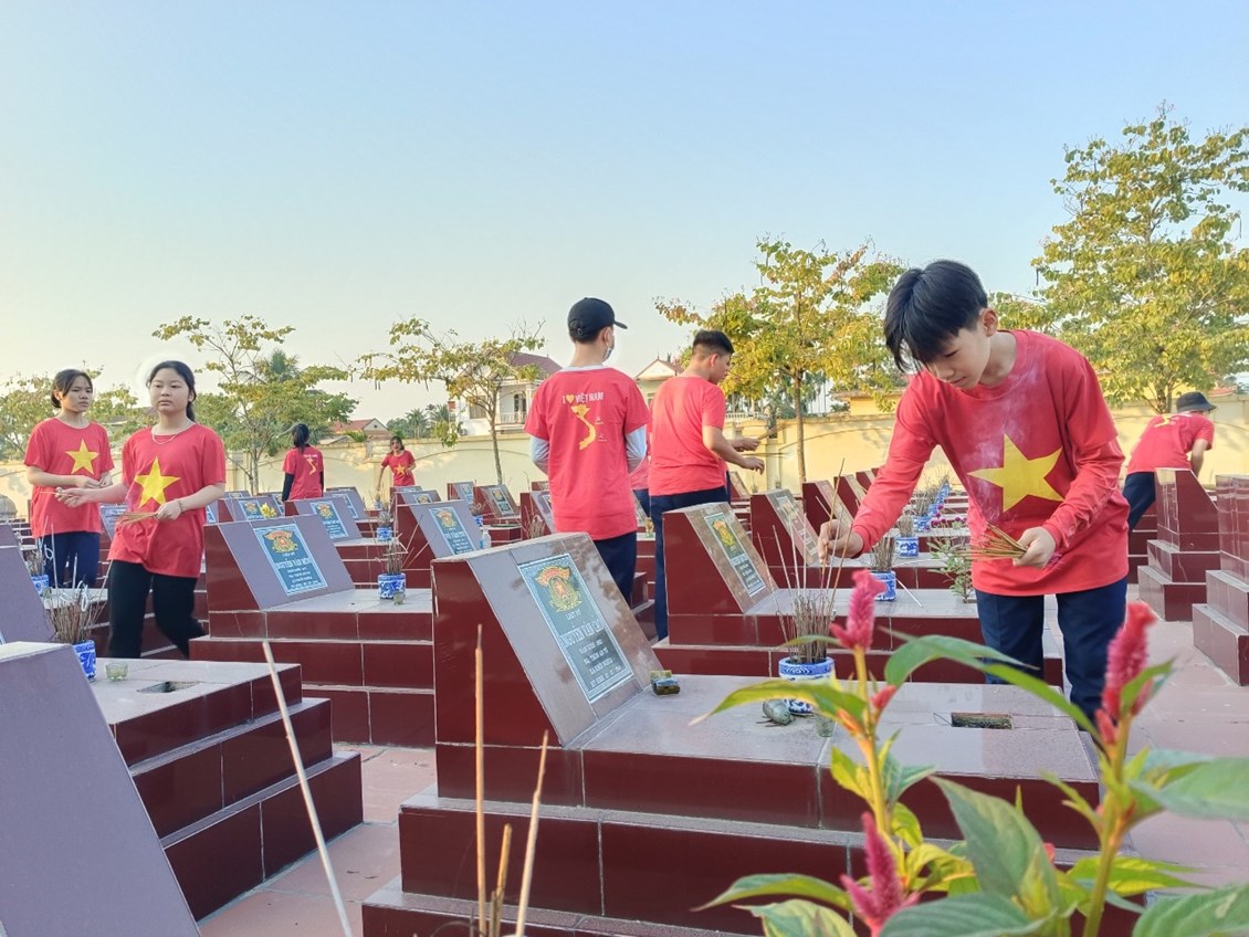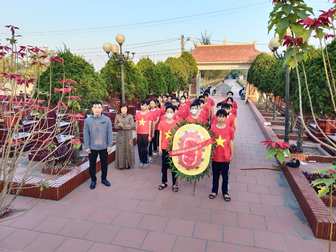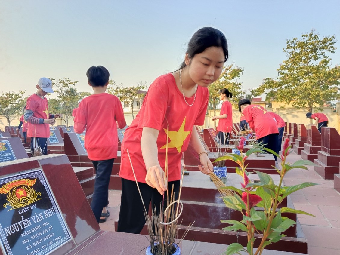 Tưởng nhớ đến các anh hùng liệt sĩ đã hi sinh cả cuộc đời cho quê hương đất nước, Liên đội đã tổ chức dâng hương tưởng niệm các anh hùng liệt sĩ tại Nghĩa trang liệt sĩ xã Khởi Nghĩa. Trong không khí trang nghiêm, thành kính, các đội viên đã cùng ôn lại trang sử hào hùng về các anh hùng liệt sĩ - những người con trung kiên, dũng đã không tiếc máu xương hiến dâng tuổi thanh xuân và cả tính mạng của mình để bảo vệ nền độc lập, tự do và thống nhất Tổ quốc. Tiếp đó, Liên đội đã tổ chức quét dọn vệ sinh toàn bộ khuôn viên Nghĩa trang liệt sĩ. Nghĩa trang liệt sĩ không chỉ là nơi an nghỉ của liệt sĩ mà còn là công trình văn hóa, lịch sử mang đậm giá trị nhân văn, ghi nhận công lao to lớn của các anh hùng liệt sĩ đã hi sinh vì nền độc lập, tự do của Tổ quốc, vì cuộc sống bình yên của nhân dân.