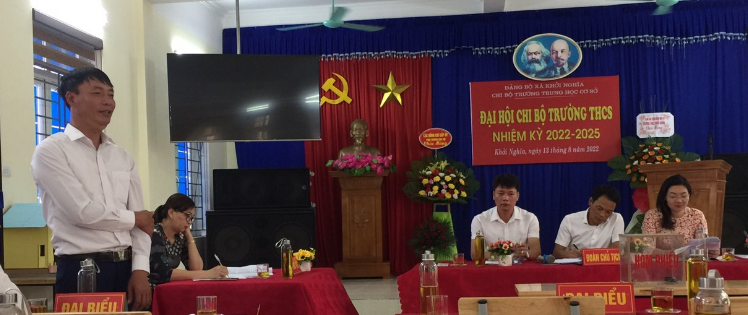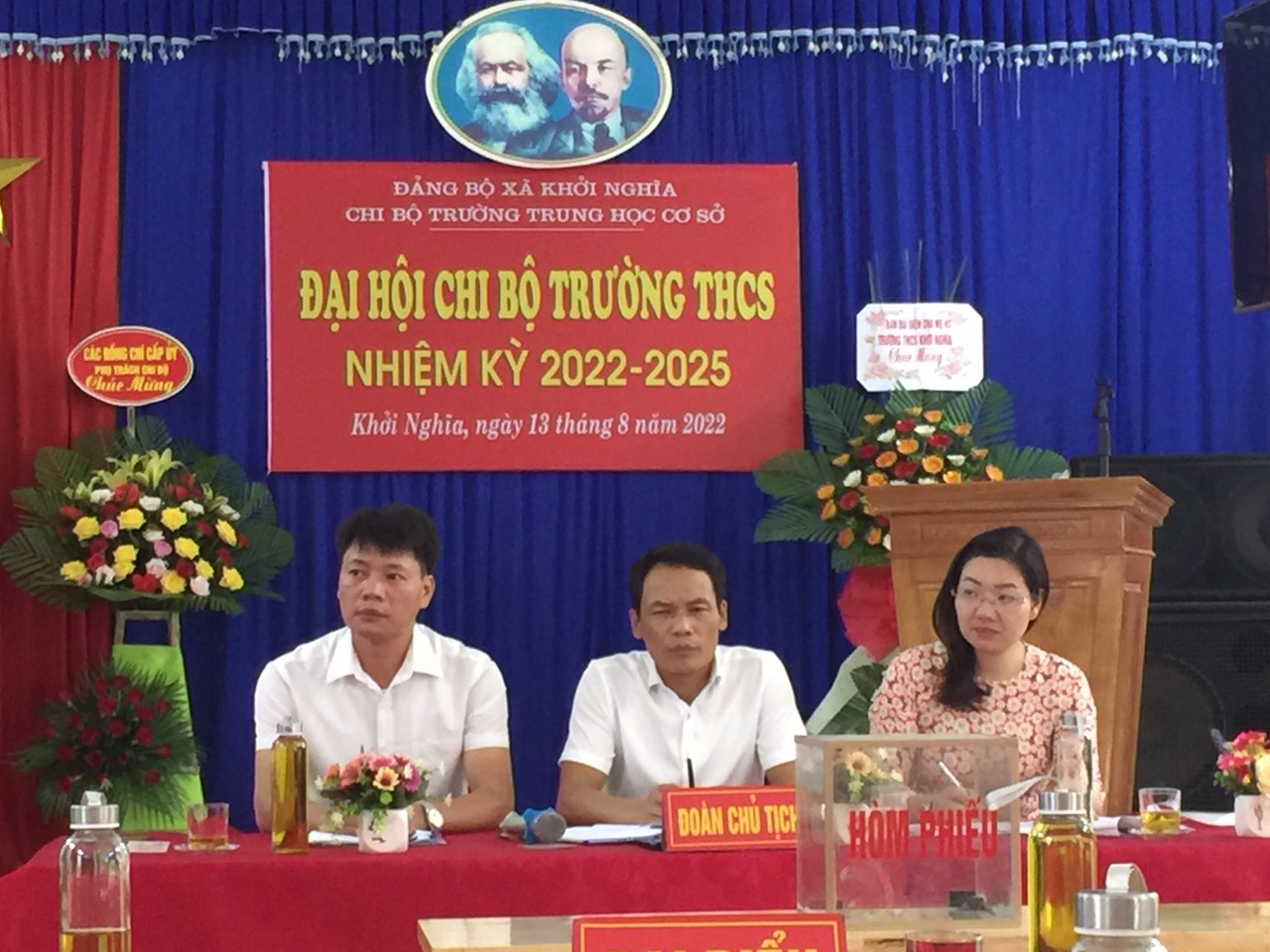 Tại Đại hội, đồng chí Phạm Văn Cánh - phó Bí thư Đảng ủy xã Khởi nghĩa đã ghi nhận và biểu dương thành tích mà chi bộ trường THCS Khởi Nghĩa đã đạt được trong nhiệm kỳ qua. Đồng thời đồng chí cũng chỉ rõ những mặt ưu điểm và những tồn tại với một sự kỳ vọng Chi bộ THCS Khởi Nghĩa sẽ đạt được như bản phương hướng và mục tiêu mà Chi bộ đã đề ra ở nhiệm kỳ mới.