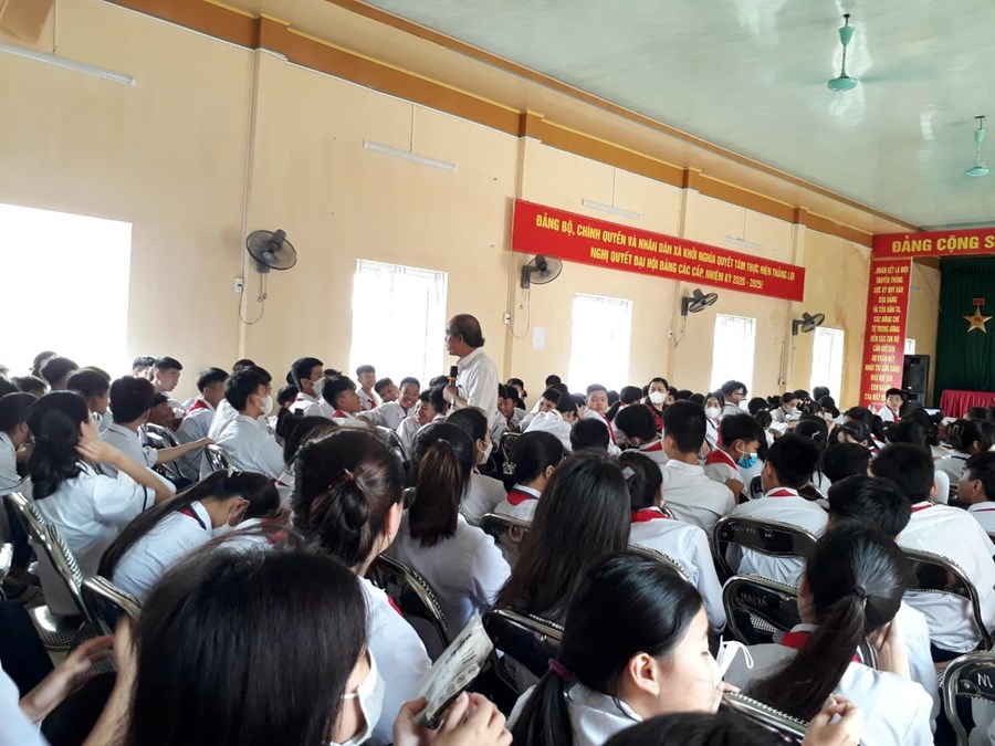Ông Hoàng Văn Luất - Phó giám đốc trung tâm y tế - Trưởng phòng DS-TT&GDSK huyện Tiên Lãng trao đổi cùng các em học sinh.