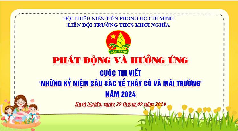 Căn cứ Văn bản số 623/CTV-GDDT ngày 20/09/2024 của Ban tổ chức cuộc thi thuộc Bộ GD&ĐT; Công văn số 2916/SGDĐT-VP ngày 24/09/2024 của Sở GD&ĐT; Công văn số 497-GDĐT ngày 26/09/2024 của Phòng GD&ĐT về việc phát động, hưởng ứng cuộc thi viết “Những kỷ niệm sâu sắc về thầy cô và mái trường” năm 2024. Sáng ngày 07/10/2024 Liên đội trường THCS Khởi Nghĩa đã triển khai đến 100% các bạn đội viên tại giờ sinh hoạt dưới cờ đầu tuần.