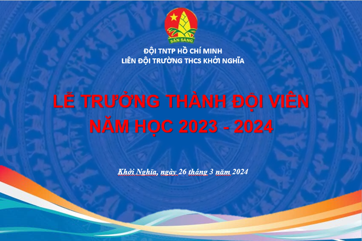 Thực hiện chương trình công tác Đội và phong trào thiếu nhi trong trường học năm học 2023-2024 của Liên đội trường THCS Khởi Nghĩa,thiết thực hoạt động chào mừng kỉ niệm 93 năm ngày thành lập Đoàn TNCS Hồ Chí Minh (26/3/1931-26/3/2024) và 83 năm ngày thành lập Đội TNTP Hồ Chí Minh (15/5/1941-15/5/2024), chiều ngày 26/3/2024 các Chi đội 9A, 9B tổ chức Lễ trưởng thành Đội cho 57 đội viên nhằm đánh dấu bước trưởng thành, phấn đấu, rèn luyện, cống hiến của các em trong Đội TNTP.