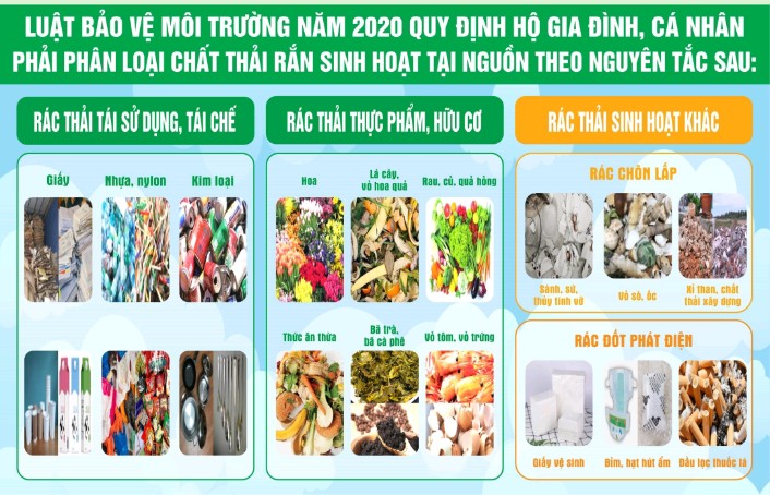 Luật bảo vệ môi trường năm 2020 quy định về phân loại chất thải sinh hoạt tại nguồn theo nguyên tắc: