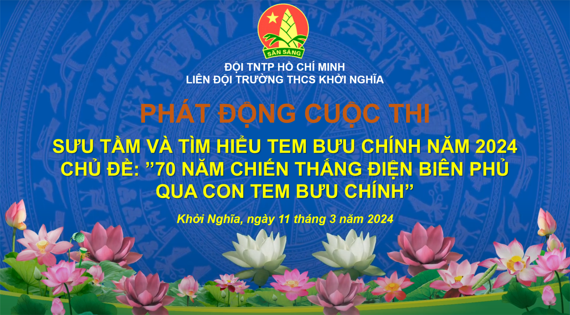 Hưởng ứng kế hoạch số 315/KH-HĐĐTW/BĐVN/HTVN ngày 29/12/2023 của Hội đồng Đội Trung ương, Tổng công ty Bưu điện Việt Nam, Hội tem Việt Nam “Về việc tổ chức cuộc thi sưu tầm và tìm hiểu tem bưu chính năm 2024 với chủ đề “70 năm chiến thắng lịch sử Điện Biên Phủ qua con tem bưu chính. Ngày 18/3/2024 Liên đội trường THCS Khởi Nghĩa triển khai và hướng dẫn tới 9 phụ trách Chi đội và 340 em học sinh tham gia cuộc thi.