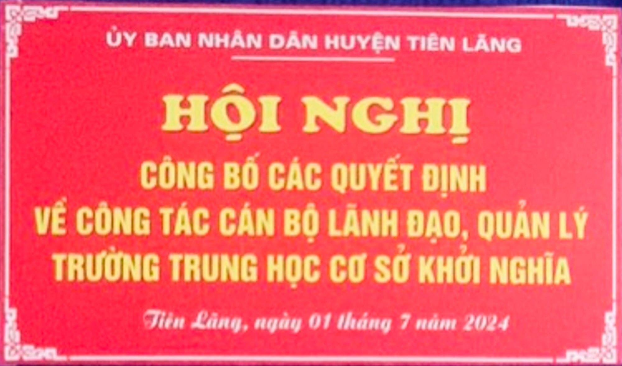 Thực hiện Quyết định số 1686/QĐ-UBND ngày 28/06/2024 của Chủ tịch UBND huyện Tiên Lãng về việc điều động cán bộ quản lý ngành giáo dục. Chiều ngày 01/07/2024 tại phòng Hội trường, Trường THCS Khởi Nghĩa đã tổ chức Hội nghị công bố quyết định điều động cán bộ quản lý ngành giáo dục. Theo đó, đồng chí Phạm Thị Hương được điều động giữ chức vụ Hiệu trưởng trường THCS Khởi Nghĩa.